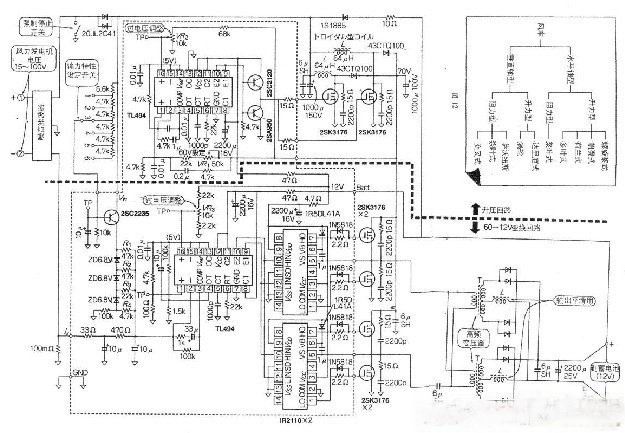 本電路最大輸出時效率達80%—90%,若輸出500w,則有50W—100W功耗,這些都轉化為晶體管、變壓器、電感、二極管的熱量。為散熱,設置了自動感溫的排氣扇。本電路輸出30W—400W的效率達85%。
