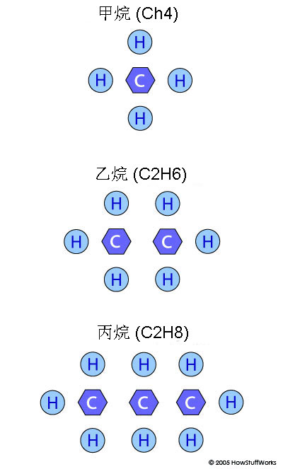 天然氣主要由甲烷以及其他烴氣組成。 烴是僅包含碳元素和氫元素的有機(jī)化合物。 天然氣中的烴稱為飽和烴,因?yàn)樗鼈兯奶己蜌湟詥捂I相連成鏈。 如下圖所示,甲烷是最簡單的飽和烴。