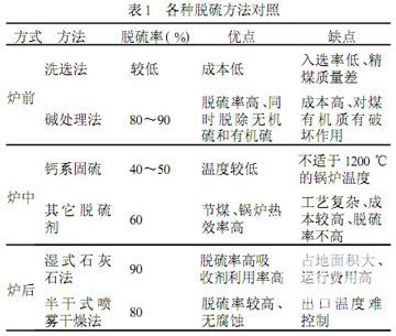 脫硫技術可分為爐前、爐中、爐后3種方式,各種脫硫方法對照見表1。