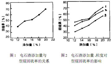 從圖1可知電石渣對型煤的固硫能力隨電石渣添加量的增加而提高。但注意必須控制電石渣的添加量不能過大,以免影響型煤的燃燒狀況和熱損失。圖2中 ,1、 2、 3 條曲線代表電石渣粒度越來越大。反映出電石渣的粒度對固硫效果有一定影響。電石渣粒度越小,固硫能力越強。所以增加電石渣的比表面積有利于提高固硫率。