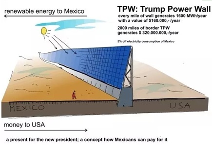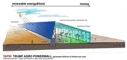 特朗普不是執(zhí)意要在美墨邊境建墻嗎?不是經費沒有著落嗎?荷蘭一家設計所(FARO)為特朗普總統(tǒng)獻計獻策,設計了Trump Power Wall(TPW),把這座分割兩國邊境的墻變成造福兩國的光伏墻。