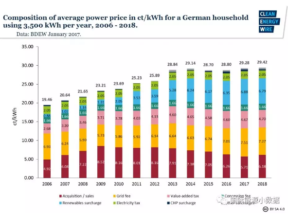 從2000年到2017年,隨著可再生能源的比重快速增長,德國可再生能源電價(jià)附加征收標(biāo)準(zhǔn)從每千瓦時(shí)0.2歐分提高到了6.88歐分,占居民電價(jià)比例從1.4%提高到23.5%。2017年達(dá)到可再生能源電價(jià)附加的最高點(diǎn),從此開始下降,2018年已經(jīng)下調(diào)至6.79歐分。