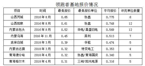 國家能源局為“促進(jìn)光伏發(fā)電技術(shù)進(jìn)步、產(chǎn)業(yè)升級、市場應(yīng)用和成本下降”,推進(jìn)光伏領(lǐng)跑者基地建設(shè)。2016年8月,在山西芮城基地招標(biāo)中,當(dāng)時(shí)當(dāng)?shù)氐墓夥鼧?biāo)桿電價(jià)0.85元/千瓦時(shí),協(xié)鑫報(bào)出了最低價(jià)0.65元,6家評優(yōu)單位平均報(bào)價(jià)0.775元;在此后陽泉基地項(xiàng)目上,協(xié)鑫再次報(bào)出了0.61元的低價(jià)。今年4月,協(xié)鑫和青海國資在青海德令哈基地報(bào)價(jià)0.32元,5家評優(yōu)單位平均電價(jià)0.34元,而當(dāng)?shù)毓夥鼧?biāo)桿電價(jià)0.55元;此后比鄰的青海格爾木基地,三峽和陽光報(bào)價(jià)只有0.31元,5家評優(yōu)單位平均電價(jià)0.316元,已經(jīng)低于青海燃煤火電平均上網(wǎng)標(biāo)桿電價(jià)0.3247元/千瓦時(shí)。