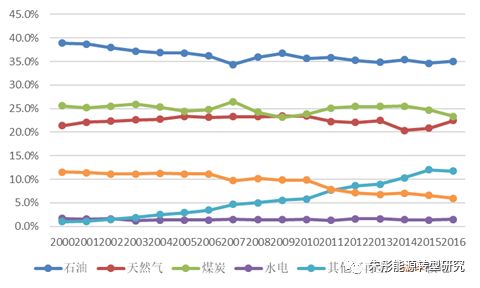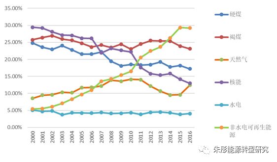 2000年以來,天然氣和核能在美國向“清潔能源”中起到了非常重要的作用。2000-2016年年間,天然氣份額從26%增加到31.5%,核能份額從7.8%增加到8.4%,非水可再生能源從0.76%增加到3.7。同期煤炭消費(fèi)份額大幅下降,從24.6%下降到15.8%,而石油消費(fèi)份額大致保持不變。