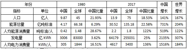 中國改革開放40年來,經濟實現長足發展,能源與電力持續穩定增長。2017年能源總量比1980年增加了7.31倍,發電量增長21.35倍。中國的能源和電力不僅滿足了中國人民日益增長的需求和國家經濟發展需要,也向全世界提供了大量物美價廉的產品,使中國成為全球最大的商品出口國。同時也造成,中國人均能源消費超過全球平均水平的1.22倍,人均電力消費超過全球平均水平1.36倍,而人均GDP仍未達到世界平均水平,說明中國能源電力提效仍有巨大空間。