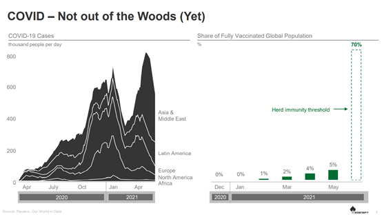 迄今為止,疫苗接種覆蓋了約5%的世界人口。即使不算重新接種,按照這樣的速度,也需要12-14個月才能為世界上70%的人口接種疫苗。整個地區(qū)都無法獲得疫苗,而且到目前為止,前景還很不明朗。因此,群體免疫的發(fā)生和危機的恢復(fù)將需要更長的時間。