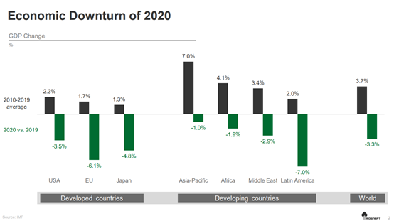 受大流行病的影響,全球經(jīng)濟在2020年出現(xiàn)了創(chuàng)紀錄的崩潰——在經(jīng)歷了每年近4%的十年增長后,全球GDP下降了3.3%,即3萬億美元,這相當(dāng)于法國和英國的GDP。