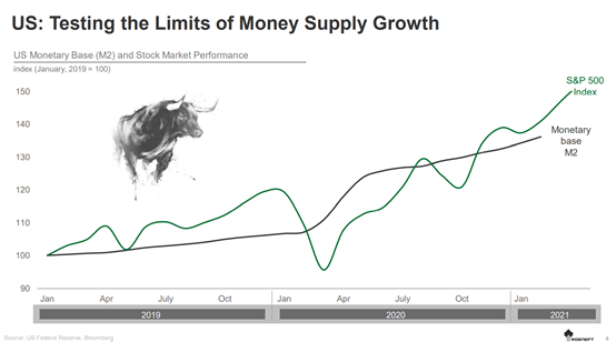 以美國的貨幣增長為例。美國政府采取的行動導(dǎo)致了2020年25%的貨幣增長,這種增長將在未來一年繼續(xù)下去。這些支持經(jīng)濟的計劃,以及美聯(lián)邦儲備系統(tǒng)的量化寬松政策,對實體經(jīng)濟復(fù)蘇的貢獻有限。
