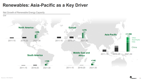 亞太地區(qū)成為可再生能源發(fā)展的火車頭,因為在過去的10年里,其可再生能源能力的增長比歐洲和美國高幾倍。據(jù)分析,這一趨勢將在未來10年內(nèi)持續(xù)下去。因此,中國、印度和其他亞太國家的可再生能源產(chǎn)能投產(chǎn)范圍將超過歐洲的2.5倍以上。這將是一個平衡的增長,將與常規(guī)能源的發(fā)展同時進行。