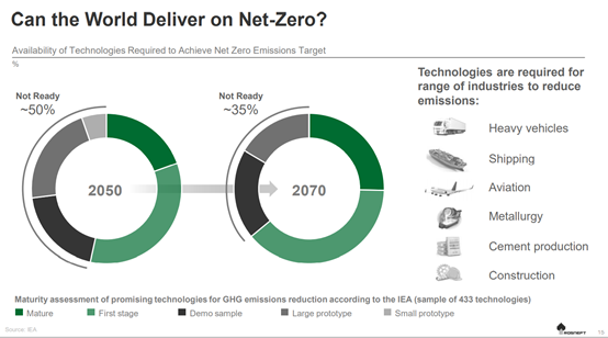 盡管一些技術(shù)已經(jīng)成功地實施和推廣,包括電動乘用車、太陽能和風(fēng)力發(fā)電,但某些部門將需要突破性的解決方案來實現(xiàn)能源效率的大幅提高和排放量的減少。顯而易見的例子包括商業(yè)汽車運輸、海洋和航空運輸、冶金、水泥生產(chǎn)和其他能源密集型產(chǎn)業(yè)。盡管在這些領(lǐng)域已經(jīng)邁出了第一步,但要開發(fā)出具有成本效益的商業(yè)技術(shù)還需要幾十年的時間。同時,上述情況意味著強烈的投資需求:根據(jù)IEA的數(shù)據(jù),這一數(shù)字約為每年4萬億美元,相當(dāng)于全球GDP的4%。