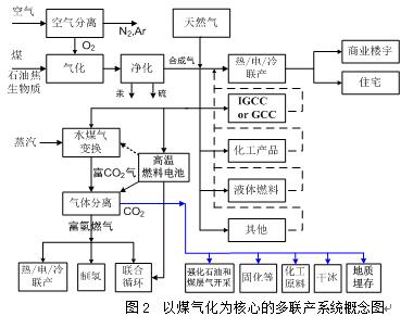 如前述,我國的一次能源在相當長的一段時間內主要是煤,而煤的直接燃燒引起嚴重的環(huán)境問題,因而,煤的現代化利用——以煤的氣化為龍頭的多聯產系統是對應我國能源問題嚴重挑戰(zhàn)的戰(zhàn)略方向。煤基多聯產系統的框圖如下: