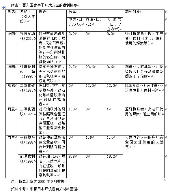 日本政府從2004年開始對環境稅方案進行了反復修訂,在2005年10月形成了最終方案。方案規定了環境稅稅率為2400日元/噸碳。經測算,預計環境稅征收總額將達到約3700億日元,每戶家庭平均每年負擔2100日元。相比2004年的方案來說,為了減輕反對的壓力,2005年方案的征稅對象范圍收窄,減免稅范圍和幅度擴大了。新環境稅方案在減免措施方面作出的規定主要有:一是對于采取措施努力降低排放量的高排放用戶可以減稅50%~60%;二是考慮到鋼鐵制造業等使用煤炭、焦炭的行業暫無其他適宜的替代能源,因而實施免稅;三是對煤油減免50%的稅收。