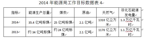 2014年能源工作目標中擬定,能源消費總量38.8億噸標準煤左右,增長3.2%;單位GDP能耗0.71噸標準煤/萬元,比2010年下降12%;能源消費彈性系數達到0.43左右;非化石能源消費比重提至10.7%,天然氣占一次能源比重達到6.1%,煤炭降至65%以下。