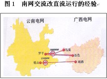 必須重視36年來主要貫徹《電力系統安全穩定導則》,才使我國成為世界安全首位的關鍵,因此今后我國必須繼續嚴格貫徹。因為南方電網繼續認真貫徹《穩定導則》,隨電源/負荷增長需要,采用直流隔離再分2~3個分區,既縮短交流線路輸送距離,又解決交直流并列的不安全問題,已經能源局批準,又計劃用直流背靠背再將[廣東分東西兩個小區],既能控制短路容量增長,又解決將來更多直流饋入各小區等一系列安全問題。特別是現已實現第一步將云南長距離送廣東由交流改為直流,(圖1)大大提高整個南網結構的可靠性,并解決交流輸電的固有穩定缺陷,原交、直流并列運行時如直流故障,負荷轉移到交流就會穩定破壞。所以這個交流改為直流經驗現在就值得全國推廣。