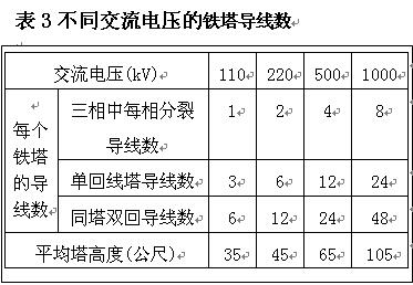 交流特高壓1000kV線不僅每相為8分裂,一回線共3×8導線,現在全都應用同塔雙回,共48導線(表3),而且為降低環境干擾,每相不得不選粗大又昂貴的8×630導線,它比500kV線路所取的4×400導線不僅數量多一倍,而且每根導線更重更粗,同樣的覆冰厚度,重量更重,影響更嚴重。且平均塔高97m(約為1.5倍500kV塔高),塔距又長達530m,更易受風冰影響倒塔損毀,最不安全。