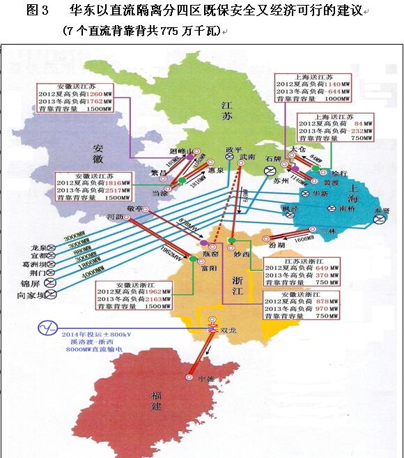 我國早已應用的[西北-華中][東北-華北]和[中-俄]黑河背靠背運行可靠,具備良好分區功能。圖3按華東省市間2012年夏季高峰/2013年冬季高峰調潮流(來自國網報告)研究直流背靠背的位置和容量,隨著電源/負荷的發展,所有省市間潮流應有減無增,以選擇其容量。
