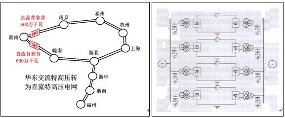今年7月1日,華南電網是我國首次成功實現了云南送廣東的原交流500kV輸電插入直流背靠背而改進為異步聯網,成為直流輸電,這一天云南電網由原"并列四直四交"改進為"八回直流"。徹底解決了原交直流并列運行時、直流故障時負荷轉移、造成交流系統失穩事故。同時解決云南送出的通道"卡脖子"問題,插入直流背靠背后,云南西電東送則由1925千瓦提升至2455萬千瓦,增幅達28%。由於遠距離交流輸電一是受穩定限制,二是易發生穩定事故,插入直流背靠背而改為直流輸電,將得徹底解決。異步聯網將徹底解決遠距離交流復雜結構的固有嚴重穩定缺陷,將大大提高了全系統的安全和可控性又提高原線路的輸送能力,又解決交流短路電流距超標問題。采用同等異步聯網經驗將華東交流特高壓電網改為直流特高壓(圖6、7)將取得如下實效: