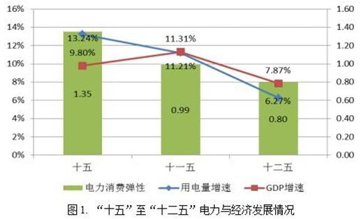從歷史發(fā)展趨勢來看,2000年以來我國用電量增速總體呈現(xiàn)下降的趨勢,由“十五”期間的13.24%降低到“十二五”期間的6.27%,“十三五”期間用電量增速還將進(jìn)一步下降,這也已是毋庸置疑的現(xiàn)實。同樣,我國經(jīng)濟(jì)發(fā)展也經(jīng)歷了從高速發(fā)展到新常態(tài)的轉(zhuǎn)變,“十二五”GDP增速明顯放緩,同時全社會用電量增速也明顯調(diào)檔;尤其是2014年以來,隨著步入經(jīng)濟(jì)新常態(tài)、產(chǎn)業(yè)結(jié)構(gòu)調(diào)整、用電結(jié)構(gòu)的逐步優(yōu)化等因素,全社會用電量增速顯著下降。2000年以來,電力消費彈性這一指標(biāo)也保持下降趨勢,這種下降趨勢將一直延續(xù)到“十三五”乃至今后很長一段時間,這也是社會發(fā)展的一般規(guī)律。