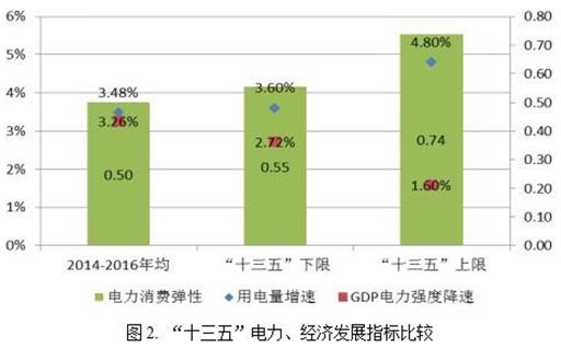 自從2014年我國步入新常態(tài),電力消費彈性的下降表現(xiàn)得更為明顯。從近3年來看(2014-2016年),GDP年均增速約6.97%,用電量年均增速3.48%,以此核算出的電力消費彈性系數(shù)約為0.5。按照“十三五”電力規(guī)劃中的電力需求展望,未來5年年均增速3.6%-4.8%,增速下限對應(yīng)的電力彈性約0.55,上限對應(yīng)的電力消費彈性約0.74。按經(jīng)濟(jì)進(jìn)入新常態(tài)后的調(diào)整態(tài)勢看,若整個“十三五”期間電力彈性比前三年還有所反彈,顯然是明顯違背規(guī)律和政策預(yù)期的。另從GDP電力強度的下降速度來看,近三年GDP電力強度年均下降速度約3.26%,按需求增速下限對應(yīng)的GDP電力強度年均降速約為2.72%,與近三年的趨勢較為一致;而若按需求增速上限看,GDP電力強度年均降速為1.6%,相比前三年顯著放緩,這與新常態(tài)下以第三產(chǎn)業(yè)和戰(zhàn)略新興產(chǎn)業(yè)為主的經(jīng)濟(jì)增長動力顯然不符。由此來看,“十三五”期間電量增長達(dá)到上限增速(4.8%)顯然不太可能,而3.6%的下限預(yù)期可能性更大。