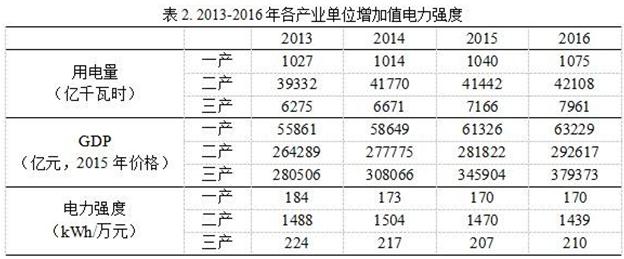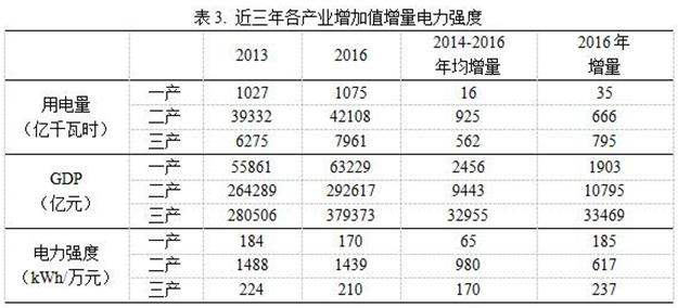 進(jìn)一步,對三次產(chǎn)業(yè)近三年的增加值增量與用電量增量的關(guān)系進(jìn)行分析。結(jié)果表明,平均來看,各產(chǎn)業(yè)近三年增加值增量部分的電力強度均比對應(yīng)年份的總體水平低,“二產(chǎn)”尤為明顯,這也與各產(chǎn)業(yè)電力強度持續(xù)下降的趨勢吻合。