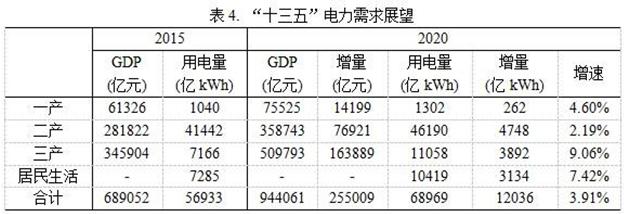 根據(jù)“十三五”規(guī)劃綱要的發(fā)展目標(biāo),“十三五”期間GDP年均增速要保持在6.5%以上,預(yù)計到2020年,我國GDP總量將達(dá)到94.4萬億元。結(jié)合電力發(fā)展規(guī)劃目標(biāo),預(yù)計“十三五”我國電力消費彈性系數(shù)約為0.74。由表2中的數(shù)據(jù)可以看出,以電力消費彈性這一指標(biāo)來看,從“十五”到“十三五”,該指標(biāo)一直呈下降趨勢。然而,“十三五”期間電力彈性能否維持0.74的水平,這仍然是一個值得深思的問題;也就是說“十三五”期間,年均4.8%甚至更高的用電量增速是值得深究的。