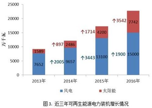 從近三年可再生能源電力裝機增長情況來看,風(fēng)電和太陽能裝機規(guī)模均快速增長,可再生裝機規(guī)模年均增長約4500萬千瓦。具體來看,截至2016年,我國風(fēng)電裝機規(guī)模1.5億千瓦,近三年年均增長約2500萬千瓦;太陽能裝機規(guī)模7742萬千瓦,近三年年均增長約2000萬千瓦。而根據(jù)“十三五”電力規(guī)劃的發(fā)展目標(biāo),2020年風(fēng)電裝機在2015年1.3億千瓦的基礎(chǔ)上新增約8000萬千瓦,年均投產(chǎn)僅1600萬千瓦,太陽能裝機規(guī)模目標(biāo)為1.1億千瓦,新增6800萬千瓦,年均投產(chǎn)僅1360萬千瓦。與近幾年的發(fā)展趨勢相比,按照規(guī)劃目標(biāo),可再生電力發(fā)展速度卻將明顯放緩。