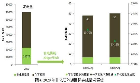從非化石能源目標(biāo)來看,根據(jù)“十三五”電力規(guī)劃,預(yù)計2020年我國非化石能源發(fā)電量為2.24萬億千瓦時。按照310gce/kWh的供電煤耗目標(biāo)(對應(yīng)的發(fā)電煤耗水平約294gce/kWh)核算,非化石電力生產(chǎn)對應(yīng)的一次能源供應(yīng)量為約6.6億噸標(biāo)煤。按照50億噸標(biāo)準(zhǔn)煤的一次能源消費預(yù)期目標(biāo)來計算,電力非化石一次能源占比僅為13.2%,15%的非化石能源占比目標(biāo)料難完成。我們考慮2020年50億噸標(biāo)煤的一次能源消費量目標(biāo)可能過于樂觀;但即便是按照較為合理的48億噸標(biāo)準(zhǔn)煤來計算,電力非化石能源在一次能源中的占比也僅為13.7%,與15%的目標(biāo)仍有較大差距。