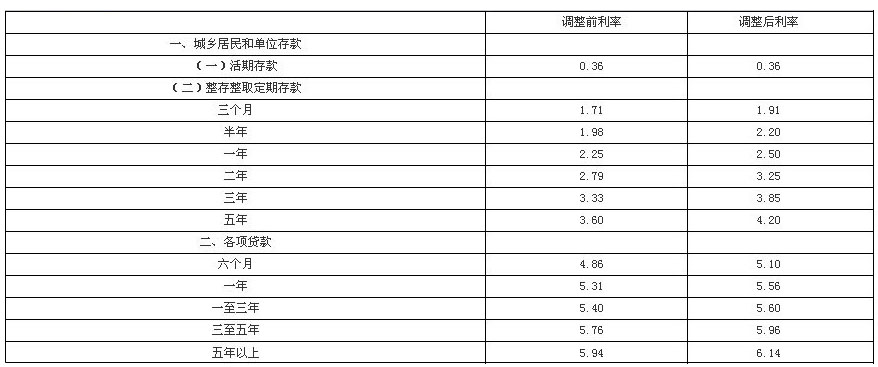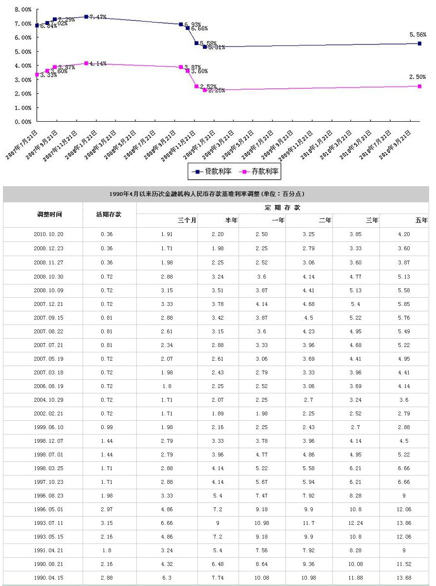 中國人民銀行決定,自2010年10月20日起上調金融機構人民幣存貸款基準利率。金融機構一年期存款基準利率上調0.25個百分點,由現行的2.25%提高到2.50%,一年期...