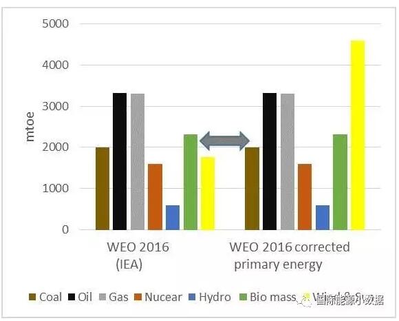 如果修正IEA的計量錯誤的話,那么IEA對2040年450ppm情境分析下一次能源結構的預測中,光伏與風電貢獻應乘以系數2.9,那樣風電光伏合計在2040年應是最大的一次能源。