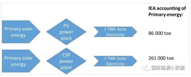 IEA的錯誤還體現在對于光熱發(fā)電的不同處理。按照IEA的統(tǒng)計方法,同樣是生產1TWh(10億千瓦時)的電能,光伏發(fā)電的一次能源貢獻量為86000噸標準油;而光熱發(fā)電的一次能源貢獻量則是261000噸標準油。