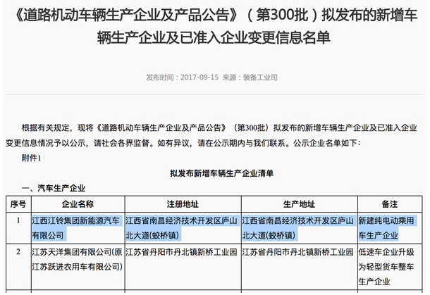 此次江西江鈴集團新能源汽車有限公司(簡稱“江鈴新能源”)進入擬發布新增車輛生產企業清單。公示截止到9月21日,如果屆時沒有變化,江鈴新能源將是繼北汽新能源、云度新能源之后,第三張新建新能源汽車資質獲得者。