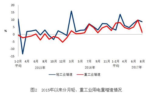 8月份,全國工業用電量3812億千瓦時,同比增長2.4%,占全社會用電量的比重為63.6%。其中,輕工業用電量710億千瓦時,同比增長8.6%,占全社會用電量的比重為11.9%;重工業用電量3102億千瓦時,同比增長1.0%,占全社會用電量的比重為51.8%。