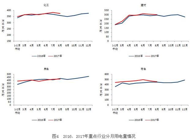1-8月份,化學原料制品、非金屬礦物制品、黑色金屬冶煉和有色金屬冶煉四大高載能行業用電量合計11934億千瓦時,同比增長5.4%,增速比上年同期提高7.6個百分點;合計用電量占全社會用電量的比重為28.7%,對全社會用電量增長的貢獻率為23.0%。其中,化工行業用電量2930億千瓦時,同比增長3.8%,增速比上年同期提高1.2個百分點;建材行業用電量2108億千瓦時,同比增長3.7%,增速比上年同期提高3.1個百分點;黑色金屬冶煉行業用電量3195億千瓦時,同比增長1.8%,增速比上年同期提高9.2個百分點;有色金屬冶煉行業3701億千瓦時,同比增長11.2%,增速比上年同期提高14.0個百分點。