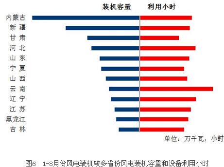 分類型看,1-8月份,全國水電設備平均利用小時為2304小時,比上年同期降低152小時。在水電裝機容量超過1000萬千瓦的7個省份中,除云南和四川其余省份水電設備平均利用小時同比均有不同程度降低,其中廣西、貴州和湖南降幅超過500小時,同比分別降低606、572和527小時,湖北和青海同比分別降低284和35小時;全國火電設備平均利用小時為2793小時,比上年同期增加67小時。分省份看,全國共有10個省份火電設備利用小時超過全國平均水平,其中,江蘇、河北、寧夏、山東、江西、陜西、安徽和內蒙古超過3000小時,西藏和云南分別僅為66和823小時。與上年同期相比,全國共有23個省份火電利用小時數同比增加,其中,湖南和江西同比增加425和317小時,寧夏、湖北、陜西和廣東增加超過200小時,福建、浙江、貴州和河北增加超過100小時,而海南和北京同比降低超過300小時,同比分別降低342和304小時;全國核電設備平均利用小時4743小時,比上年同期增加105小時;全國風電設備平均利用小時1245小時,比上年同期增加101小時。