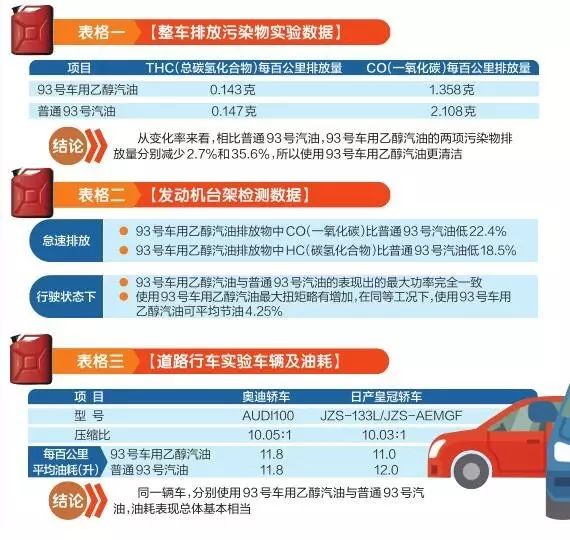 根據媒體的報道,中國石油化工股份有限公司洛陽分公司煉油工藝專家任滿年曾經對此做過實驗。他就93號車用乙醇汽油與普通93號汽油做了對比實驗,當時測試的結果是93號車用乙醇汽油和普通93號汽油在功率、扭矩、油耗方面表現基本相當,而在污染物排放方面優勢明顯。