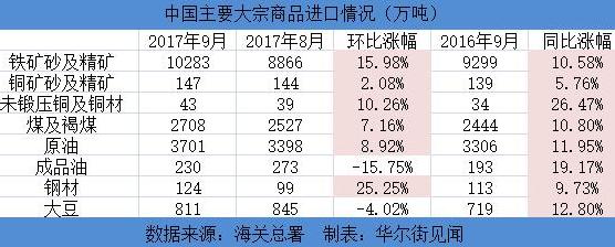 與8月比較,除了成品油和大豆外,鐵礦砂、銅礦砂、銅材、煤、鋼材、原油均環比增長。