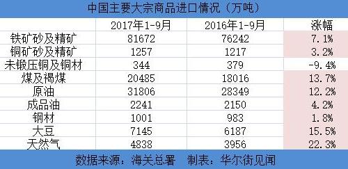 在前三季度,鐵礦砂、原油和天然氣等大宗商品進口量價齊升。