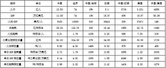盡管我們已經是全球第二大經濟體,但是我們的人均GDP與發達國家還存在巨大差距,甚至與世界平均水平仍有不小的差距。而人均能耗和人均二氧化碳排放都大大超越了全球的平均水平,人均能耗是全球的1.23倍,人均排放是全球的1.46倍。而單位GDP能耗我們中國是歐盟的3.1倍,是美國的2.24倍,全球的1.53倍;單位GDP排放我們是歐盟的4.34倍,美國的2.83倍,全球的1.8倍。