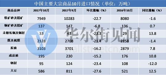 受限產和國慶長假等因素的共同影響,10月,鐵礦石、煤炭等大宗商品進口量環比大跌。