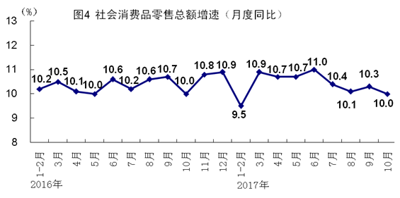 10月份,社會消費品零售總額34241億元,同比增長10.0%,增速比上月回落0.3個百分點,與上年同月持平。按經營單位所在地分,城鎮消費品零售額29537億元,同比增長9.8%;鄉村消費品零售額4704億元,增長11.3%。按消費類型分,餐飲收入3852億元,增長10.3%;商品零售30389億元,增長10.0%。消費升級類商品快速增長,10月份,限額以上單位體育娛樂用品類、化妝品類商品零售額同比分別增長19.6%和16.1%。1-10月份,社會消費品零售總額同比增長10.3%,增速與上年同期持平。