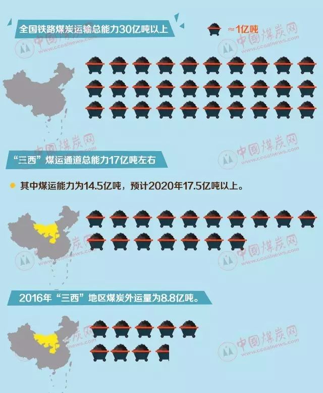 目前全國鐵路煤炭運輸總能力約在30億噸以上,“三西”煤運通道總能力約17億噸左右,其中煤運能力為14.5億噸,預計2020年將達17.5億噸以上,2016年“三西”地區煤炭外運量為8.8億噸。