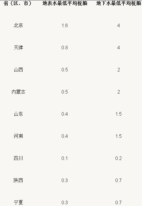 試點省份水資源稅最低平均稅額表