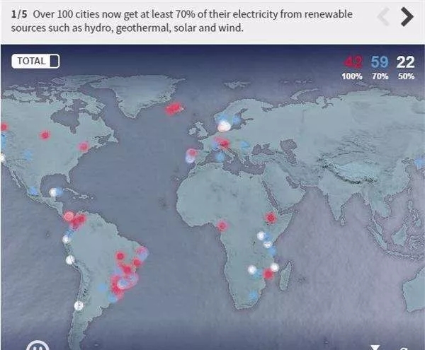 據非盈利性機構CDP數據顯示,目前全球范圍內已經有100多個城市通過利用可再生能源來實現70%的電力能源供應。