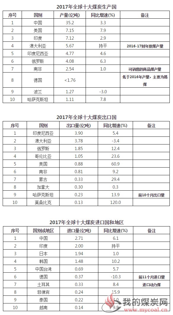 根據各國統計局、海關、煤炭產業部門等機構陸續發布的煤炭產量、出口、進口等初步統計數據整理,2017年全球十大煤炭產量、出口、進口國家和地區排名如下: