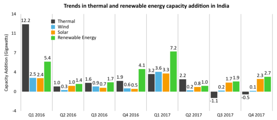 2017年,印度可再生能源裝機容量12.8吉瓦,新增煤電4吉瓦,這是印度可再生能源增量首次超過煤電。