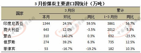 3月份出口中國(guó)煤炭274萬(wàn)噸,環(huán)比增39.2%,同比增6.3%。1-3月份累計(jì)出口中國(guó)煤炭735萬(wàn)噸,同比上漲12.5%。