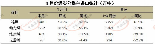 分煤種看 3月份中國(guó)進(jìn)口煤炭最大量的煤種為動(dòng)力煤,占全部進(jìn)口煤炭的46.9%;排在第二位的為褐煤,占比為35.2%。其次為煉焦煤,占比為15.1%。