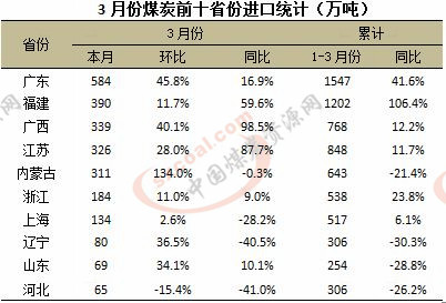 分省份看:3月份進(jìn)口量排在前五位的省份為廣東、福建、廣西、江蘇及內(nèi)蒙古。上述五省共進(jìn)口煤炭合計(jì)1949萬(wàn)噸,環(huán)比增41.4%,同比增39.2%,上述五省進(jìn)口煤炭總量占中國(guó)全部進(jìn)口煤炭的73.0%。