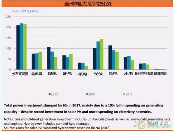 2017年全球電力投資額達7500億美元,同比下降6%。過去的十年,由于可再生能源項目開發(fā)補貼政策的出臺,以及升級、擴大電網(wǎng)等措施,全球電力行業(yè)成為資本需求高的行業(yè)。資本需求不高的熱發(fā)電投資所占份額繼續(xù)下降。