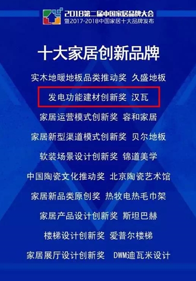 在2018第二屆中國家居品牌大會上,憑借多達364項專利于一身的“漢瓦”榮獲十大家居創新品牌中的發電功能建材創新獎,這是繼漢瓦獲得ECI Awards 國際數字商業創新大獎之后的又一榮譽。自漢瓦上市以來,得到了來自各方的廣泛認可,更被《人民日報》點贊為國之重器。